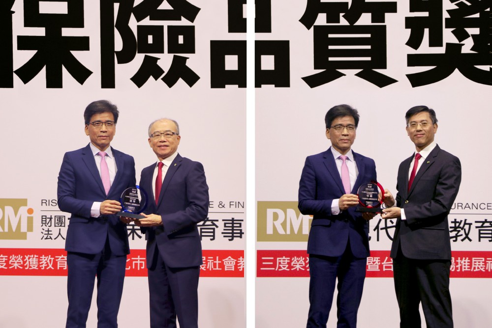 圖說:三商美邦人壽總經理陳宏昇(右圖右)、行銷長張財源(左圖右)代表接受「保險品質獎」獎盃。