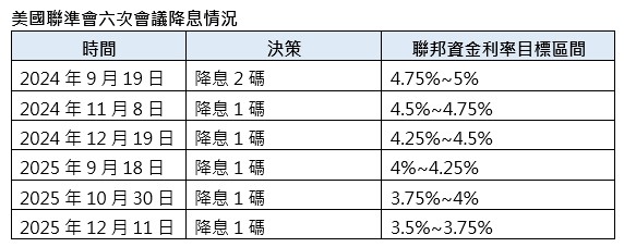 美國聯準會從2024年9月開始啟動降息循環,至2025年底已有六次決定降息,幅度一共7碼(175個基本點),聯邦資金利率目標區間從高點的5.25%~5.5%,到去年底已降到3.5%~3.75%,台灣中央銀行分析,美國2026年仍將繼續降息,降息循環下,可能繼續推升資產價格,但也可能讓固定收益部位縮水,對於不想承擔太高投資風險的客戶,將有一定的衝擊。