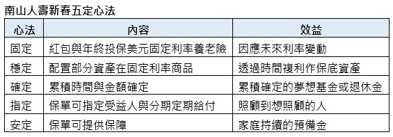 開工之後,數十億元到數百億元的年終獎金、紅包錢都會陸續回到銀行、金融工具或資本市場,南山人壽建議馬年開春可用「五定」心法,讓心定、財確定,一是「固定」,用固定利率因應可能出現的利率變動,將部分資產的增值速度固定下來;二是「穩定」,在投資前景不明朗時,有資產穩定增值,可作為保底,避免因投資市場變化,資產不增反減。